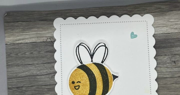 My first card I have cased a catalogue The card stock I used was Crushed Curry and crushed curry ink . I then stamped the bee on Crushed curry using memento and then punched the bee out and the wings in memento and used the punch to punch the wings . and then glued it all together