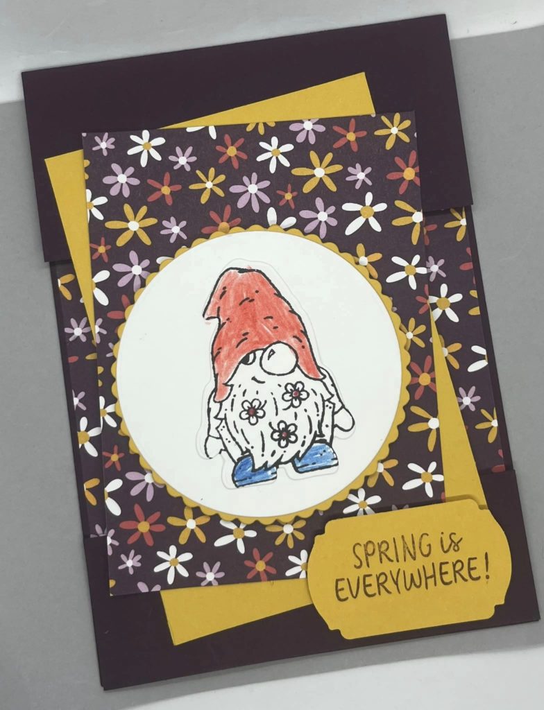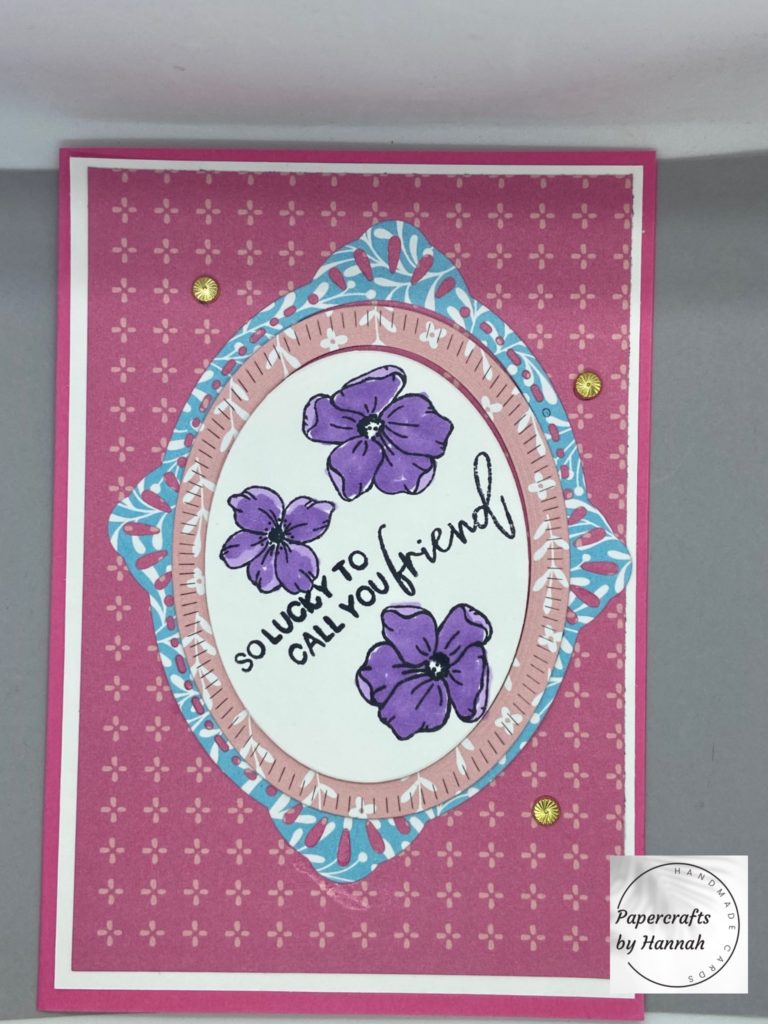 This card i used Fresh Freesia card stock with basic white card and then a strip of bright and beautiful DSP then stamped the flowers in fresh freesia and punched out the circle using the coordinating punch and then stamped the words in memento.
