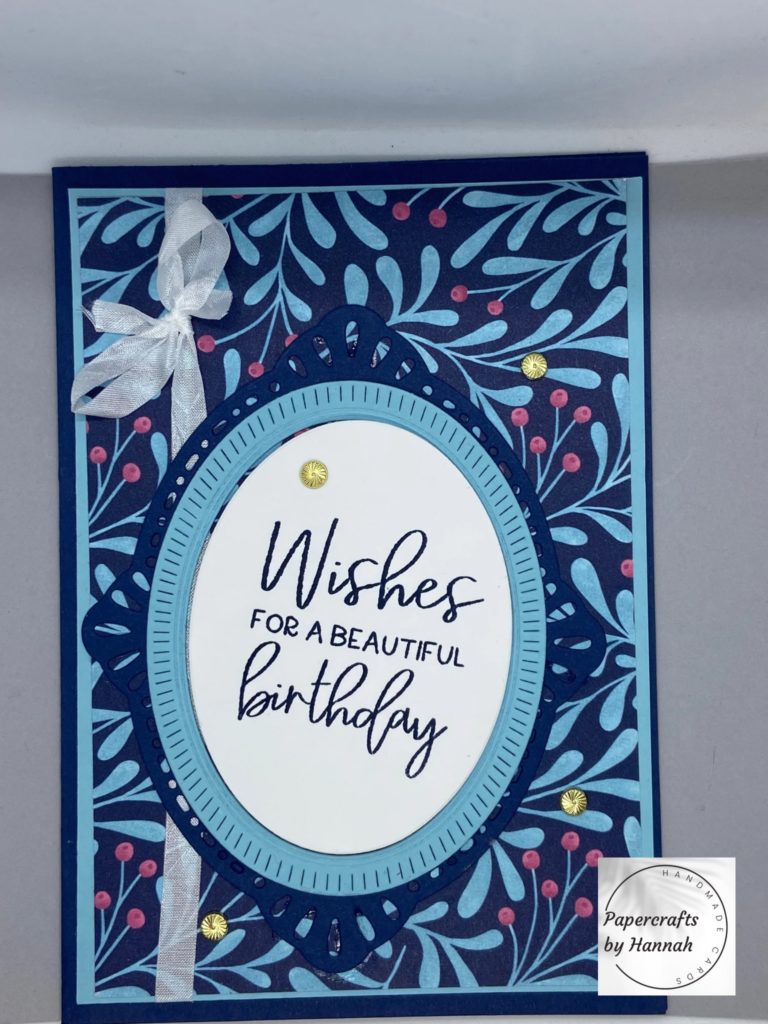 The next card i used the night of navy card stock cut at 14.9 and scored at 10.5 i then cut the balmy blue card stock at 14.4x10cm and then cut the dsp at 13.9×9.5cm and then u cut the ovals inight of navey and balmy blue and basic white, I then stamped the words in Night of nave,before putting the balmy blue and dsp on to the base add some ribbon arounf the top and botton and make a bow at the top.