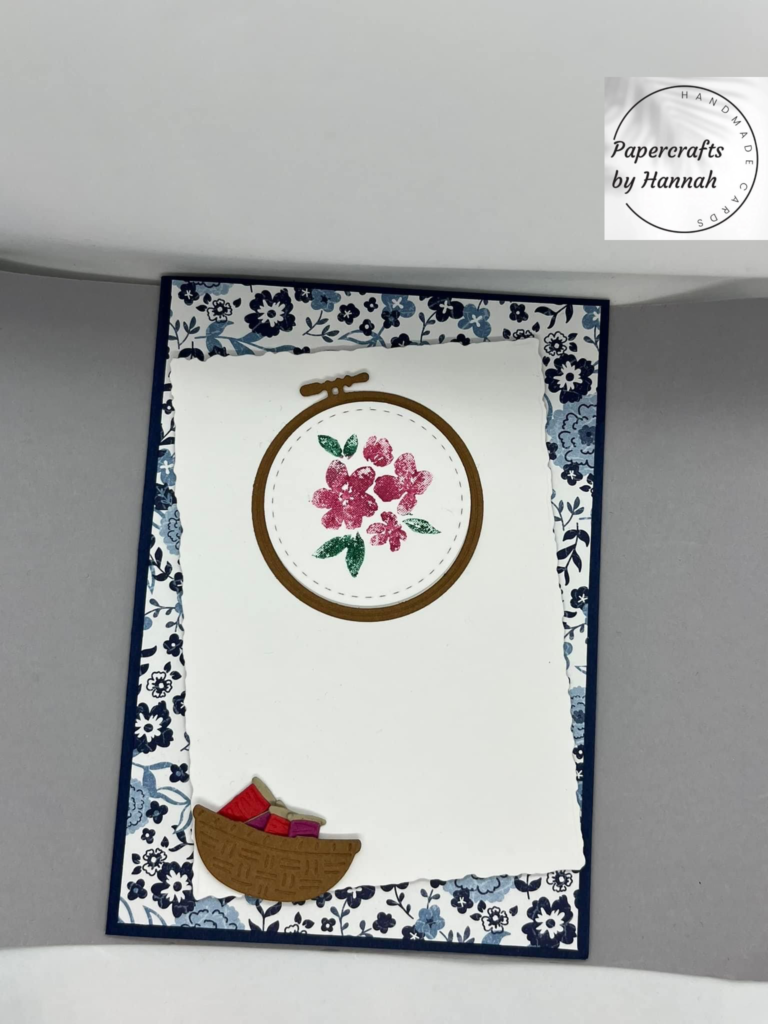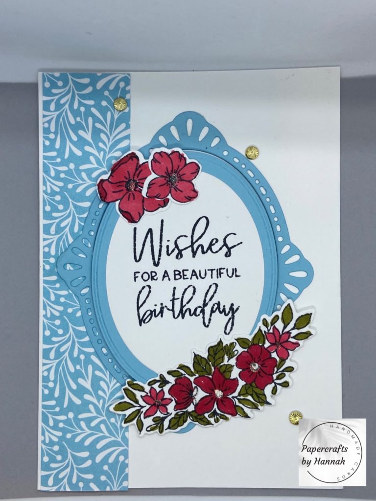 I have made 3 cards using this bundle the first one i used Basic white thick card stock for the base and then cut the balmy blue DSP at 14.9×4 cm and then i die cute the ovals shown in the picture using the framed Dies that come with the collection . I then used the basic white to cut out the small oval and stamped the flowers then coloured them in the stampin’ Blends.