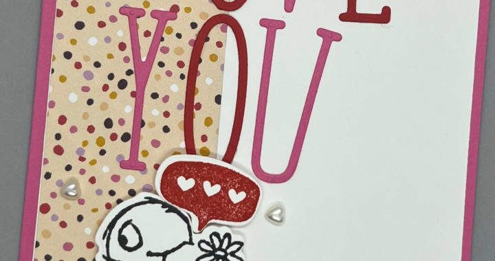 7. Die cut the I LOVE YOU words in the Alphabet a’ La Mode dies in Popy parade and polished pink .( Tip- Use the adhesive sheets on the back of the card to die cut the letters.